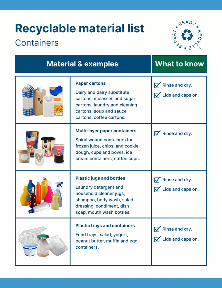 Télécharger le guide amélioré des matières recyclables pour voir facilement quoi va où. Consultez le guide de Circular Materials ci-dessous. Si vous avez des questions, n'hésitez pas à nous contacter, ça nous fera plaisir de vous aider.